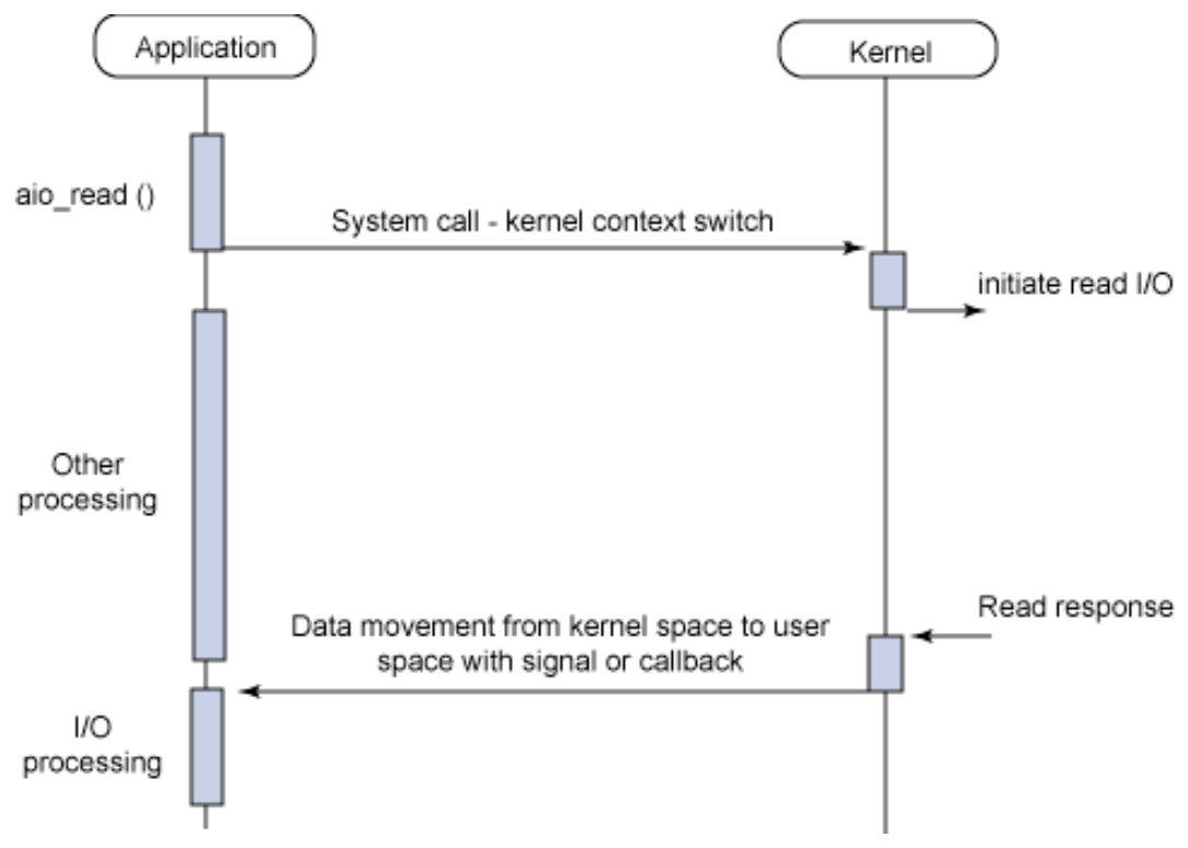I/O관점에서 설명하자면 호출된 I/O함수가 종료된 후 I/O함수의 결과 처리를 콜백함수를 통해 처리해서 작업 완료 여부를 신경쓰지 않는 경우를 의미한다. I/O완료시 커널이 유저 프로세스에게 알려준다. (콜백함수를 넘김)