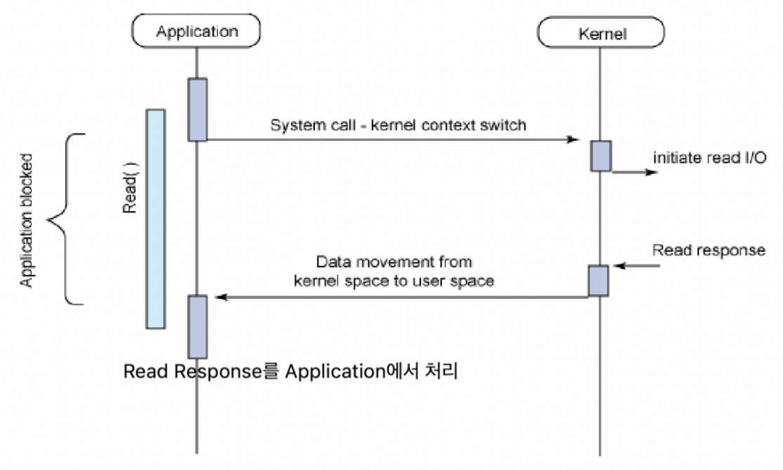 위 그림에서 보이듯 어플리케이션에서 Read()를 호출해 커널에 read I/O를 요청하면, read가 끝날 때까지 application은 block이 되어 다른 작업을 하지 못한다. 이는 read I/O가 수행될 때까지는 어플리케이션이 다른 작업을 수행하지 못한다는 것을 의미한다.