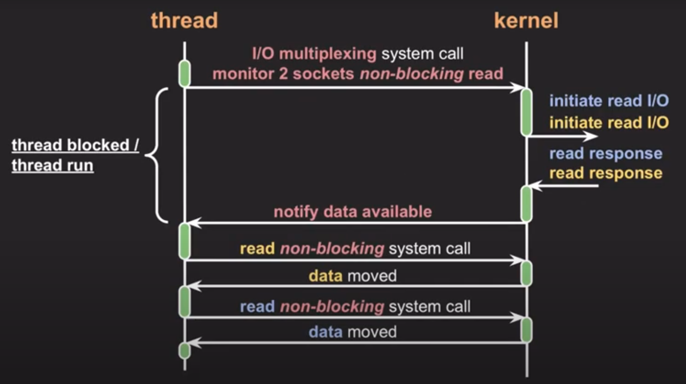 예를 들어 두 개의 소켓에 대해서 non-blocking 모드로 읽어달라고 요청을 하면 커널에서는 두 개의 소켓에 대해서 read I/O요청을 네트워크 디바이스에 보내게 되는데, 이 때 스레드는 block이 될 수도 있고, 어떻게 호출하냐에 따라서 또다른 코드를 실행하게끔 만들 수도 있음. 위 분류에선 blocking으로 표현하지만 non-blocking도 될 수 있다는 말이다. 무튼 read I/O작업이 완료되면 kernel은 thread에 요청이 완료됐음을 알리고, thread가 이 호출을 통해 깨어나면서 각각 socket에 대해 non-blocking system콜을 통해 두 번 요청을 보내 데이터를 읽어온다.